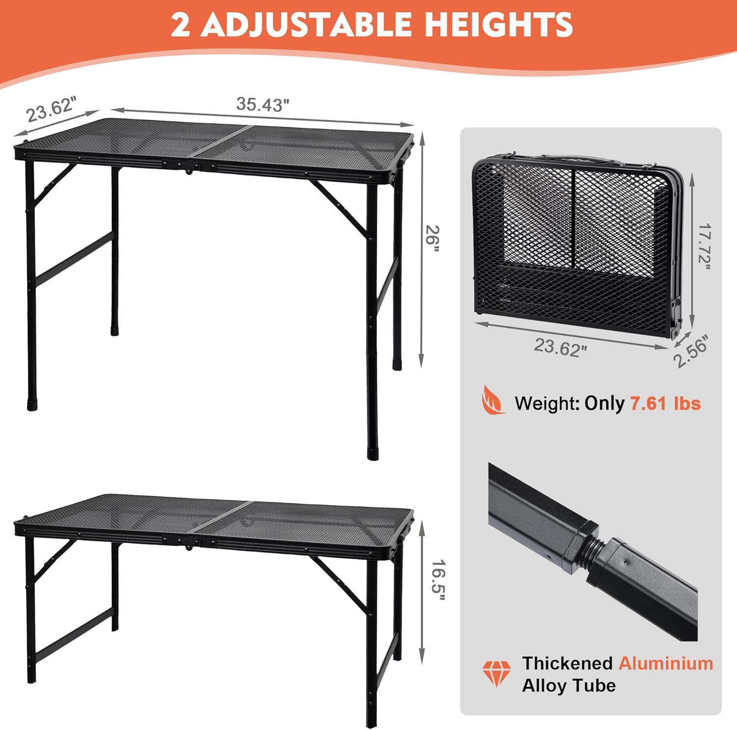 - Easy to Clean: The top of this folding table features an iron mesh design that resists heat, water and rust. Allows spills and crumbs to pass through for easy cleaning and maintenance.