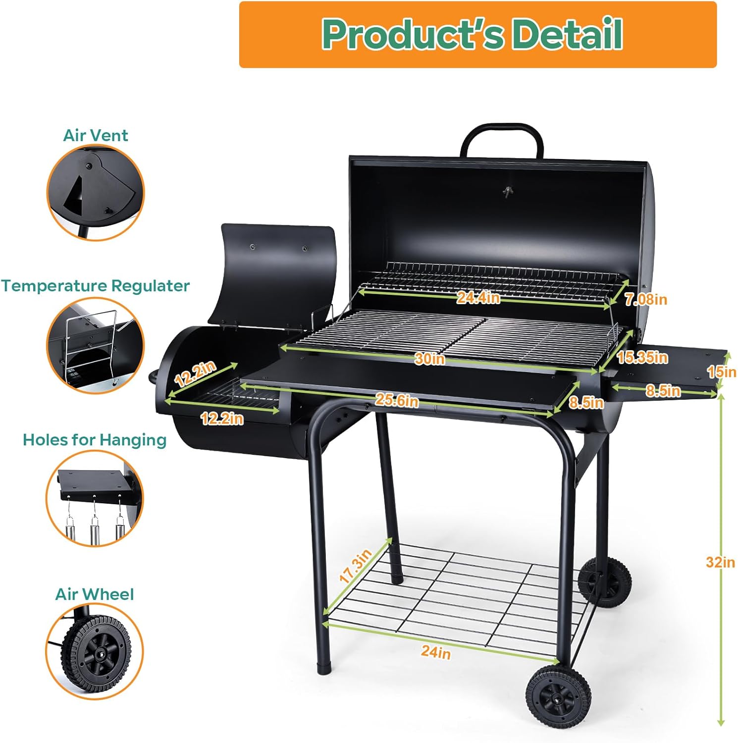 - [Firebox & Ventilation] – The smoke chamber firmly attached to the main body, smoke can through the hole into the large barrel grill to create a smoke-filled environment, Smoke flavour enthusiast can add different wood chips in the firebox chamber to smoke meat, Chimney and side air vent can be adjusted to control airflow and release smoke effectively