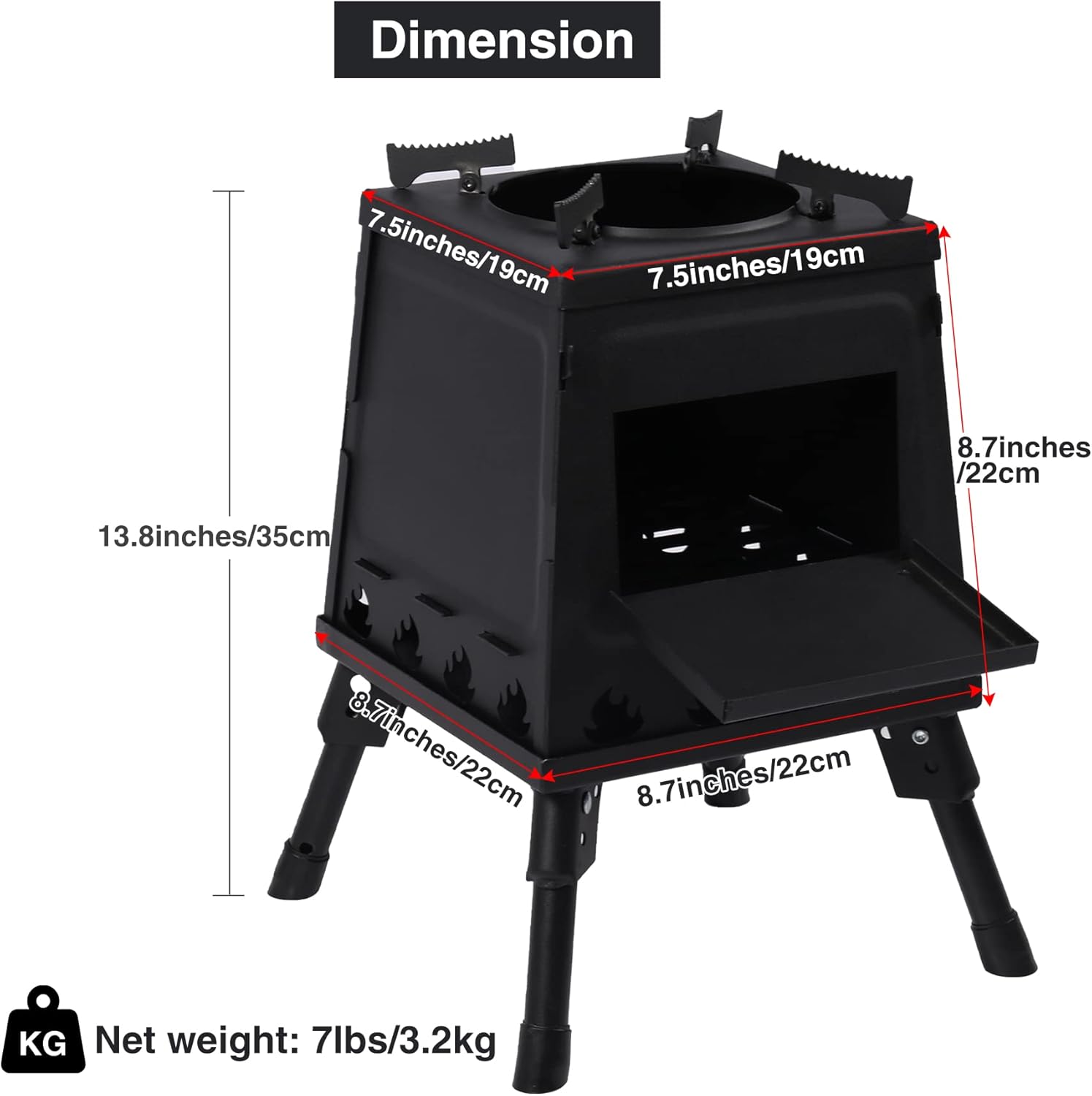 - Easy to Assemble & Carry: Easy to setup this survival stove within minutes. Unfolded size: 8.7 x 8.7 x 13.8inches/22 x 22 x 35cm. Folded size: 9.4 x 9.4 x 4inches/24 x 24 x 10cm. Weight: 7lbs/3.2kg. Equipped with a carrying bag for you to take it to anywhere you want.